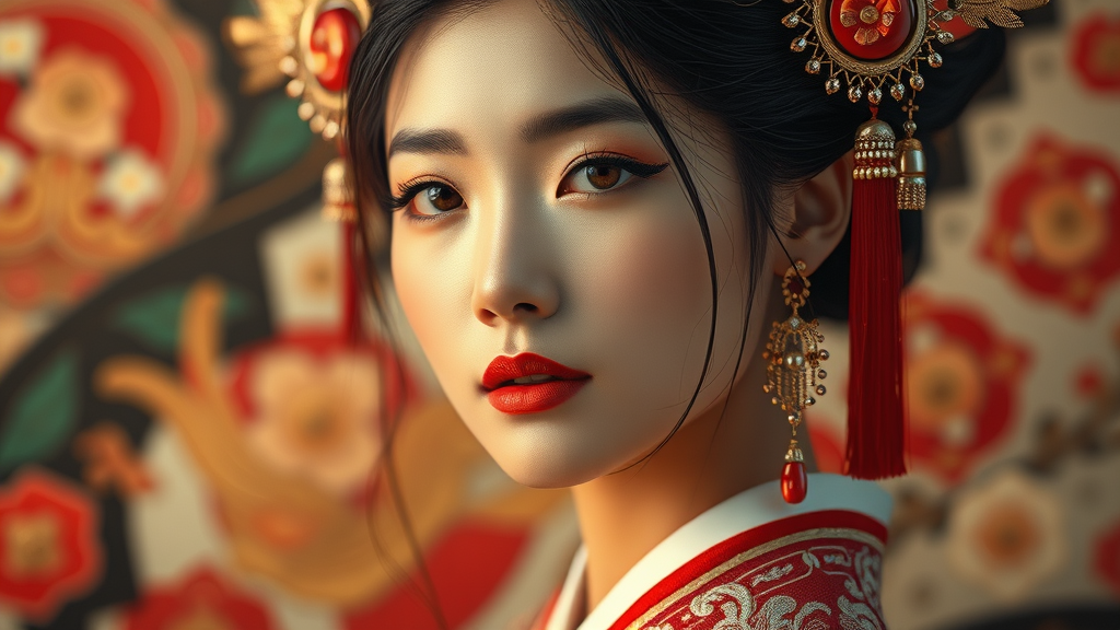 Single Korean woman, stunning and elegant, features rendered with extreme attention to detail, capturing the essence of Korean tradition in a beautiful, artistic style, with fantastic cinematic lighting. The composition focuses on one girl, showcasing her exquisitely detailed face adorned with glittering accessories. The background is abstract and inspired by art nouveau, creating a dynamic composition in ultra-high-definition 8k quality. The scene avoids imperfections like duplicates, mutations, or extraneous elements, maintaining clarity and coherence without blurriness or distortions. The emphasis is on a seamless, clear portrayal without any distractions or extraneous text.
