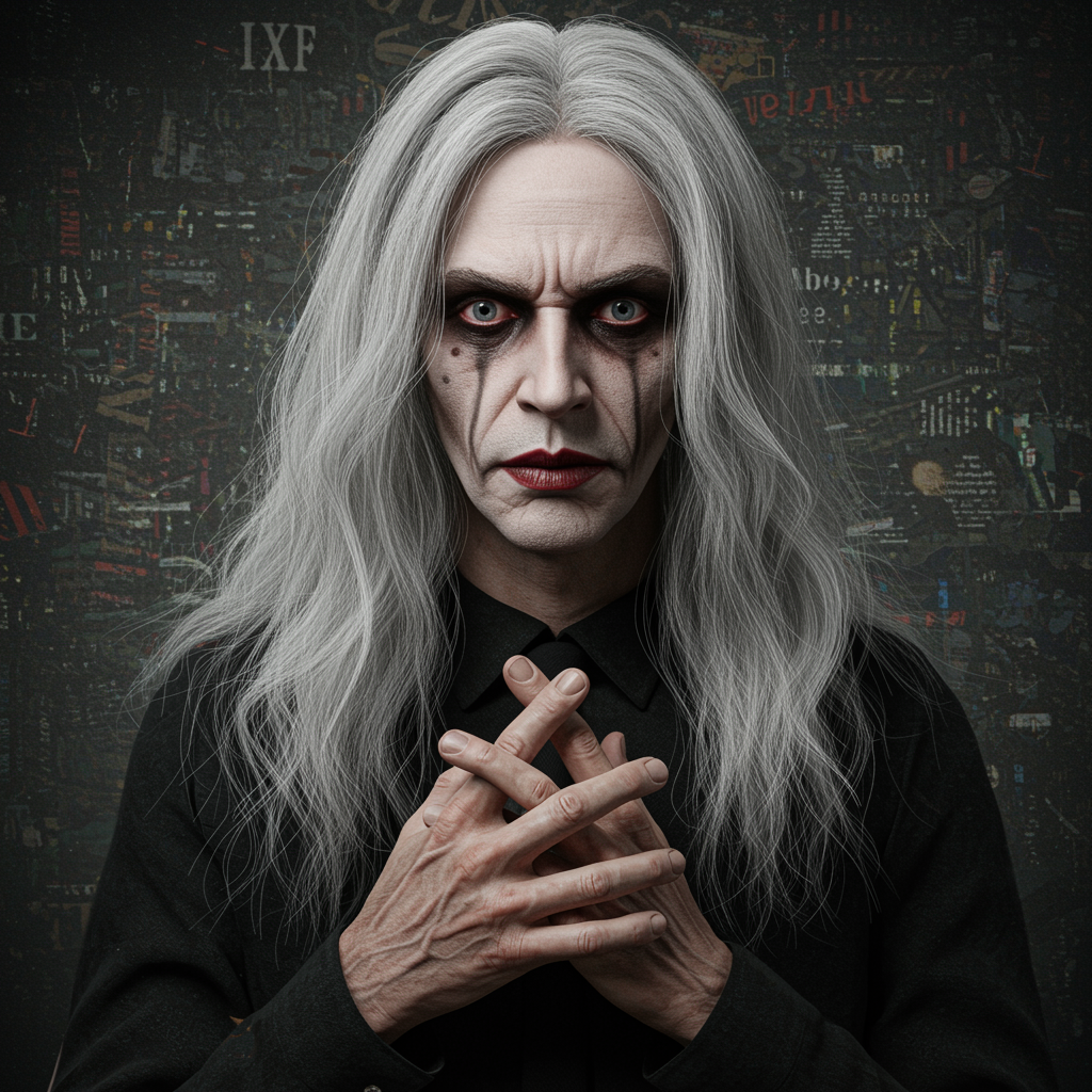 Single man, alone, showcasing long grey and white hair; the image has an out-of-focus quality, suggesting artistic imperfection. Features are exaggerated with unrealistic anatomy in a 3D-rendered style, incorporating heavy makeup elements. The overall resolution is low, focusing on distorted details like misshapen hands, and unintelligible text fragments provide an abstract background.