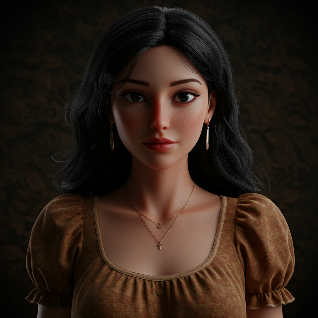 Single woman, long flowing hair, deep black eyes, silky black hair, gentle smile, stylish earrings, cozy pajamas, short sleeves, elegant jewelry, puffed sleeves, gazing directly, charming dress with puffy short sleeves, focus on upper body, intricately detailed background, warm brown dress, reminiscent of 1950s with a dark backdrop, slight blush on cheeks, soft lips, Disney and Pixar inspired, 8k resolution, UHD, HDR quality, anime and manga art style, digital artistry with glowing effects, meticulously hand-drawn, utilizing octane rendering, cinema 4d and blender techniques, dark and atmospheric, ultra-detailed in 4k, cinematic allure, sharp focus and hyperrealistic finish, enhanced depth of field, a true masterpiece with vibrant colors, 3d octane rendering concept, trending art on ArtStation, hyperrealistic and vivid, model shoot aesthetic, crafted like a professional majestic oil painting by masters like Ed Blinkey and Atey Ghailan, Studio Ghibli essence, invoking styles of Jeremy Mann, Greg Manchess, Antonio Moro, highly trending on ArtStation and CGSociety, intricate detailing, high precision, sharp clarity, dramatic photorealistic paintwork, inspired by midjourney and Greg Rutkowski, facial features include soft freckles and artistic boldness.