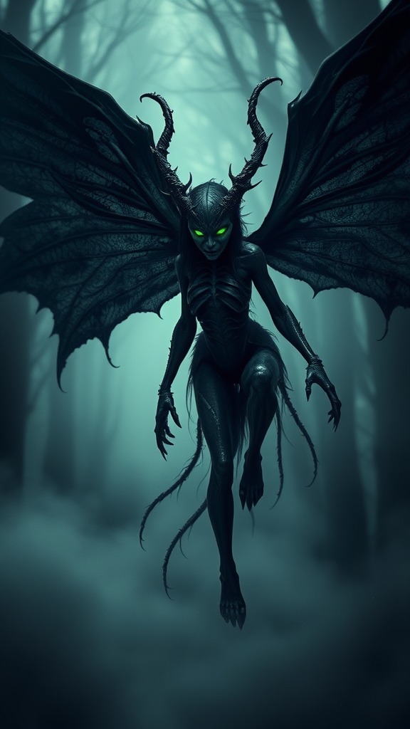 Sinister dark fairy with menacing wings prowling the forest, eyes glowing eerie green, enveloped in a dense, haunting mist; exuding a demonic and unholy presence; unsettling and nightmarish aura; detailed and intricate design with an emphasis on horror elements; dramatic and chilling lighting; striking photorealistic and cinematic quality, ultra-high definition.