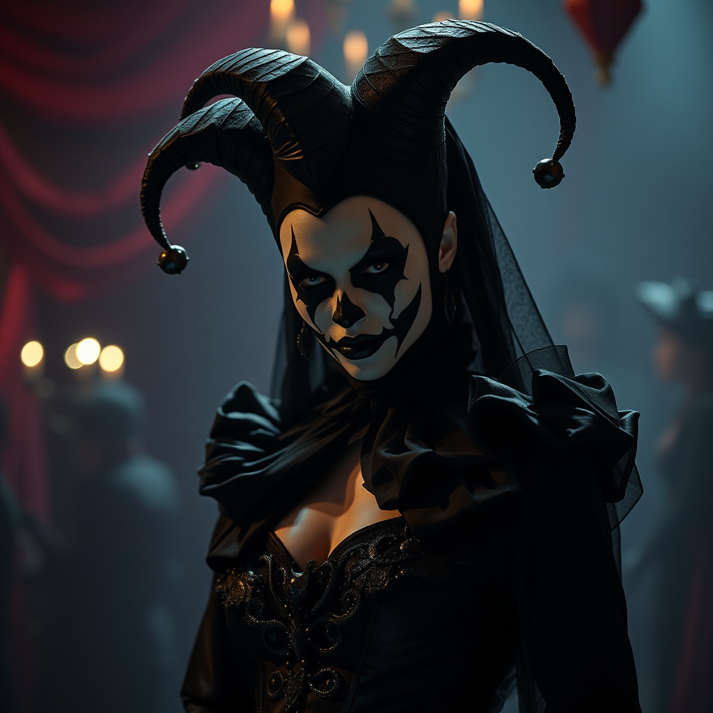 Sinister female harlequin clad in gothic black attire, haunting the shadows of a grotesque and macabre circus performance, exuding an atmosphere of horror. The intricate design and detailed costume reflects the eerie elegance of the dark carnival, illuminated by dramatic, cinematic lighting that casts deep shadows and enhances every nuanced feature. The scene is captured in photorealistic 8k resolution with cinematic noise, evoking a chilling yet captivating spectacle that lingers in the imagination.
