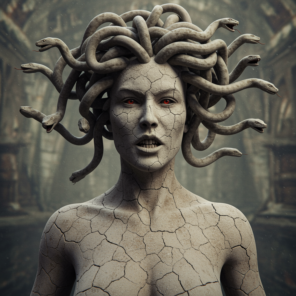Sinister grin on a Medusa figure, her pale white cracked skin resembling an ancient, dusty rock face. Snakes writhe from her head in a twisted, dramatic dance. Her shoulders are chiseled, and her eyes are hauntingly realistic. The hyperdetailed, high-resolution scene captures every intricate detail in sharp focus, set against a detailed, eerie backdrop. Her hands are perfectly formed, with skin that showcases a lifelike texture and subsurface scattering. The overall effect is one of photorealistic horror, drawing the viewer into its creepy, yet captivating allure.