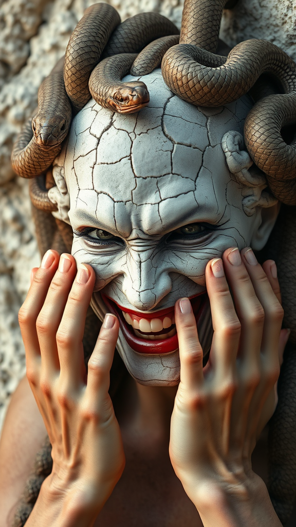 Sinister smiling Medusa with cracked, pale white skin, set against a dusty white rock face, evoking horror. Her chiseled features are framed by snakes growing from her head, exuding a dramatic presence. The scene is hyperdetailed and high-resolution, capturing intricate details with HDR and sharp focus. The detailed background complements her perfect hands and realistic eyes, showcasing detailed skin texture and subsurface scattering. The overall effect is realistic and photorealistic, creating an eerily captivating image.