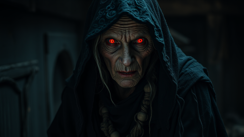 Sinister witchy crone in a shadowy ancient cabin, clad in a ragged, soot-black cloak, her weathered visage marked by fiery red eyes; adorned with arcane, dark talismans, emanating a demonic aura. Unholy, spine-chilling presence; steeped in horror and darkness, featuring elaborate, intricate designs and detailing. Dramatic, atmospheric lighting enhances a photorealistic, cinematic intensity, ultra-high definition in 8k.
