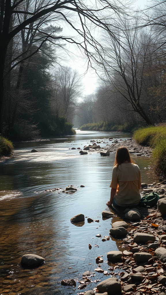 Sitting by the serene stream, silence whispers through the gentle flow, a tranquil mind at peace amidst the stillness and breath of the wild. The calm, dreamy essence envelops the scene, reflecting clear waters reminiscent of Renato Muccillo and Andreas Rocha’s serene landscapes. The scene is unmarred by distractions; no logos, unnatural colors, or disfigurations to disrupt the idyllic view. The focus remains on natural beauty, with harmonious proportions and realistic detail, ensuring everything blends seamlessly into the peaceful environment.