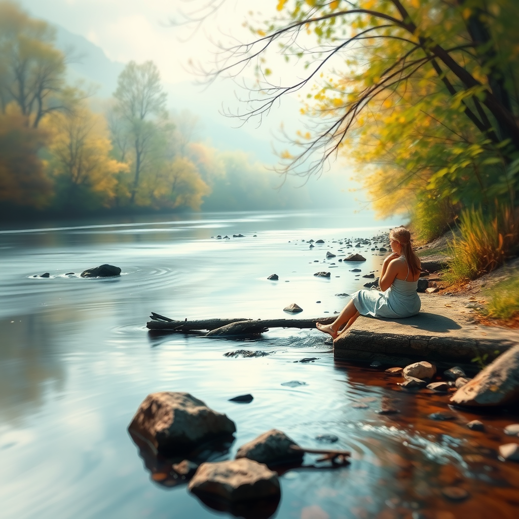 Sitting serenely by the stream, the gentle flow of water whispers in soft tones, creating a tranquil atmosphere. The mind finds peace and stillness, enveloped in the dreamy essence of the natural world, where clarity shimmers in the water. The scene unfolds in a high-definition landscape reminiscent of the artistry of Renato Muccillo and Andreas Rocha, capturing the essence of calm and serenity. Abstract elements intertwine with vivid colors, embracing the imperfections of blurred lines and experimental forms. The artwork emerges with an artistic playfulness, where the unexpected meets the serene, crafting a unique vision that transforms perceived flaws into features that tell a story of tranquility and dreamlike wonder.