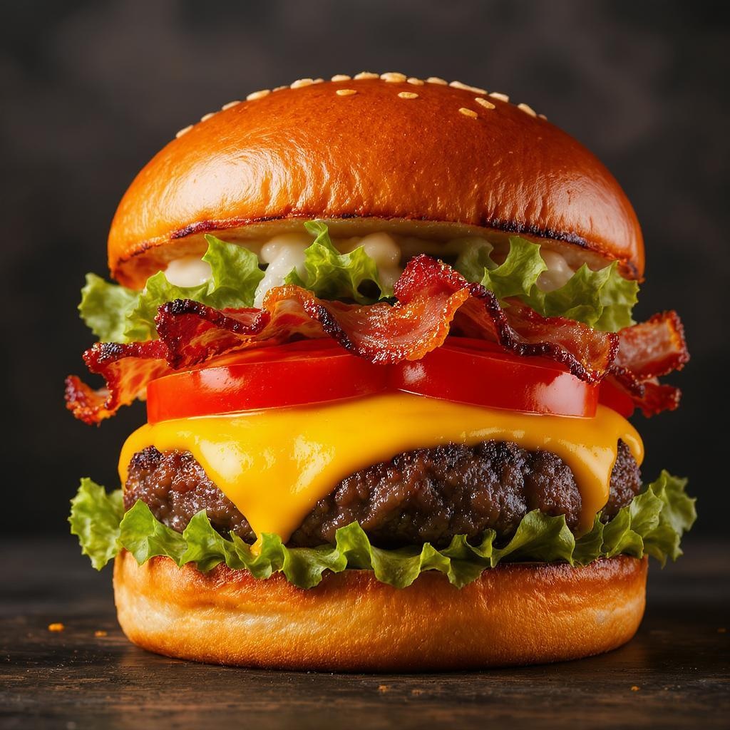 Sizzling gourmet hamburger stacked with savory bacon, crisp lettuce, juicy tomato, and melted cheese; promotional imagery; ultra-high-quality; product showcase; vibrant colors; detailed render; irresistibly appetizing.