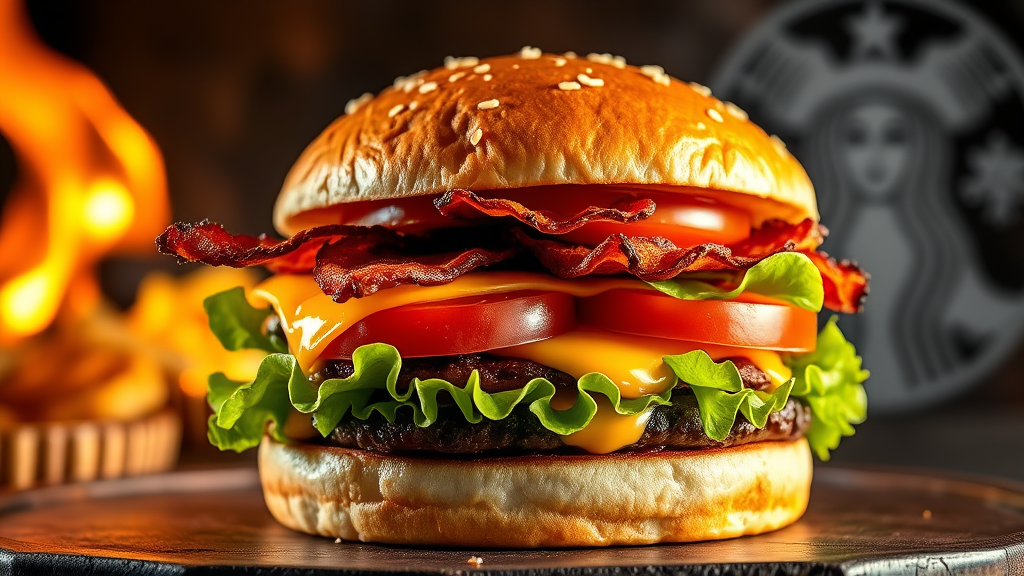 Sizzling hamburger with crispy bacon, fresh lettuce, ripe tomato, and melted cheese crafted as a promotional image, showcasing hyperquality with a product shot in full-color, rendered in intricate detail to appear irresistibly delicious and mouthwatering.