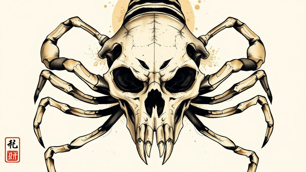 Skeletal visage of Scorpion with skull face, warm white dull lifeless eyes, menacing presence, close-up abstract art, ink and typography fusion, bold strokes and geometric shapes, harmonious palette of warm neutrals and dark accents, sparse Chinese characters inscribed in a subtle mosaic, simple yet striking design, minimalist art deco elements, delicate floral motifs, opulent gold accents on a pristine white background.