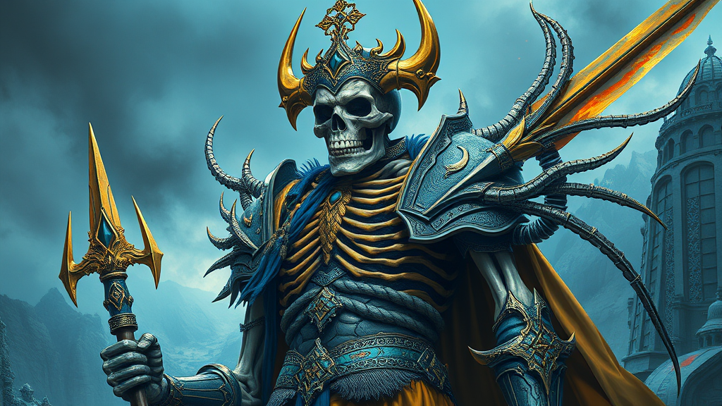 Skeleton King of Hell, intricately designed Nordic armor, elegant and scenic digital illustration, hyper-realistic and hyper-detailed, featuring royal yellow and ultramarine blue by Artgerm, WLOP, Greg Rutkowski, BROM, embodying strength and regality. Subtle creative modifications add a sense of ancient wisdom to the character, ensuring crisp details and clarity throughout the artwork, capturing a mystical yet authoritative presence with an emphasis on the supernatural and majestic elements in the composition.