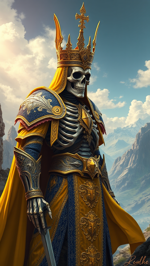 Skeleton King of the Underworld, adorned in intricately crafted Nordic-inspired armor, featuring elegant digital illustration with a scenic backdrop. The art is hyper-realistic and hyper-detailed, showcasing royal shades of yellow and ultramarine blue. Influences from artists such as Artgerm, WLOP, Greg Rutkowski, and BROM are evident. The scene is dramatic, highlighting the regal yet fearsome aura of the Skeleton King, standing amidst a breathtaking, otherworldly landscape, capturing his commanding presence and complex armor design in exquisite detail.