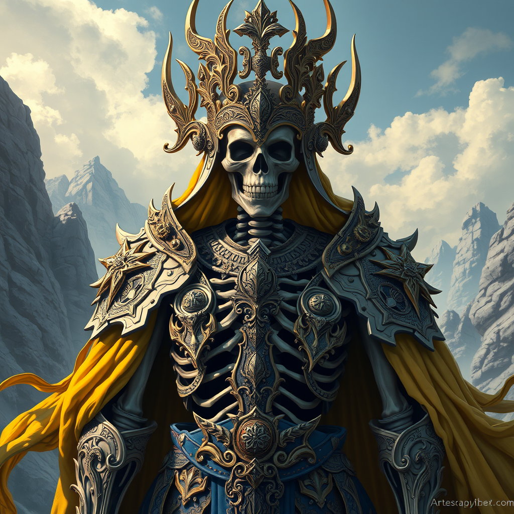 Skeleton Monarch of the Underworld, adorned in elaborately designed Nordic armor, embodying intricacy and elegance, set in a digital illustration style. The scene is hyper-realistic and hyper-detailed, featuring a palette of royal yellow and ultramarine blue. The artistry is influenced by Artgerm, WLOP, Greg Rutkowski, and BROM, with a keen attention to detail and depth. The composition is scenic, showcasing a majestic yet eerie atmosphere, with creative modifications enhancing the core theme without compromising its essence.