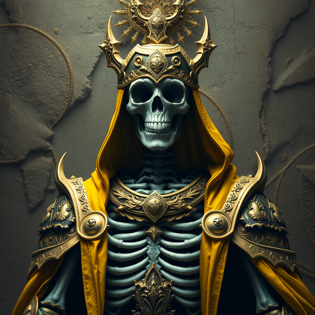 Skeleton Monarch of the Underworld, adorned in Elaborately Crafted Nordic Armor, Exquisite and Detailed, Digital Artwork, Enchanting and Scenic, Ultra-Realistic and Highly Detailed, Regal Yellow and Deep Ultramarine Blue. Inspired by Artgerm, WLOP, Greg Rutkowski, and BROM. Featuring an ethereal and mystical atmosphere, ensure features are harmonious and symmetrical, creating an imposing yet elegant figure. Background is richly textured and complements the royal theme, enhancing the depth and magnificence of the scene.