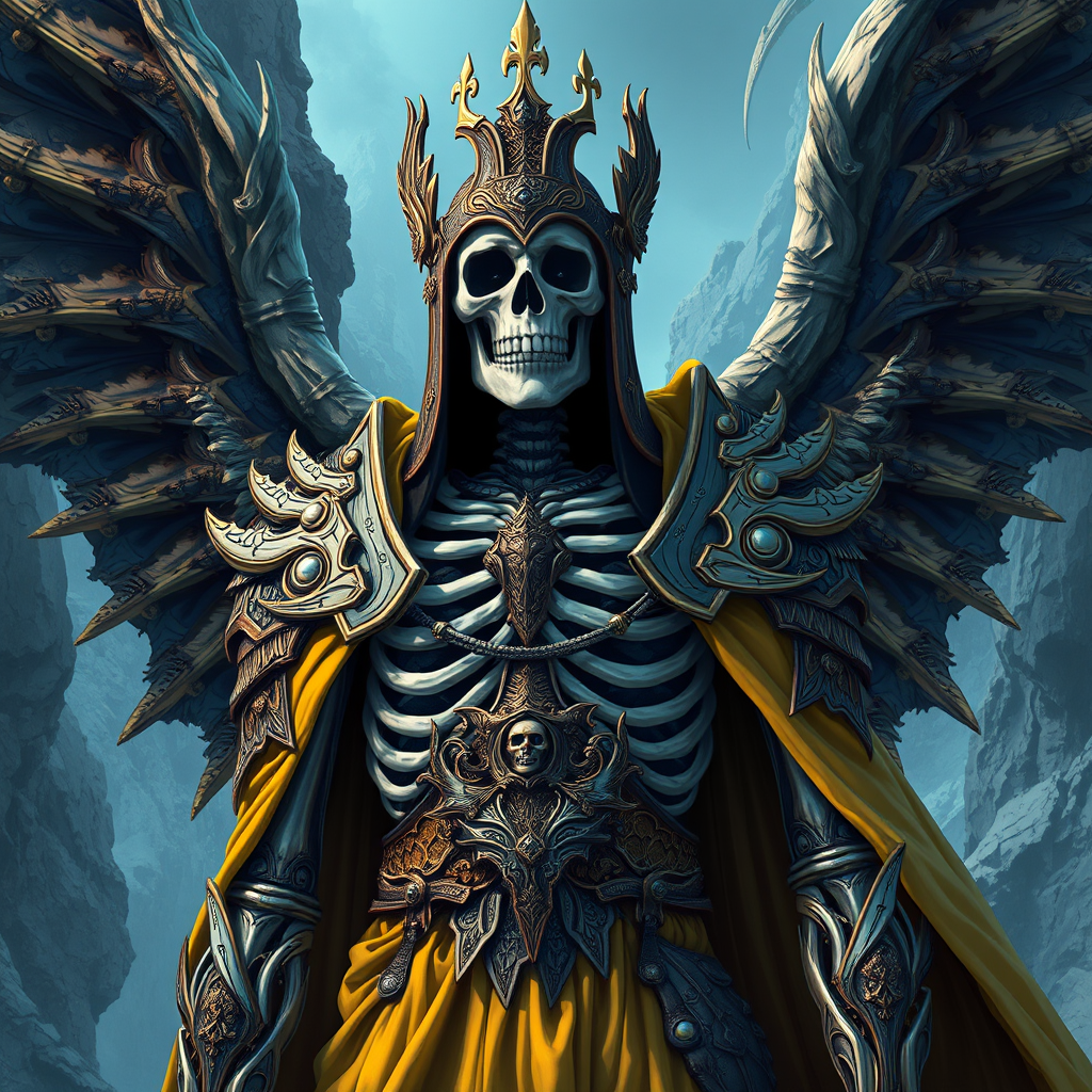Skeleton Monarch of the Underworld, adorned in exquisitely designed Nordic armor, showcasing a blend of intricate and elegant digital illustration styles. The scene is hyper-realistic and hyper-detailed, featuring royal yellow and ultramarine blue tones. Inspired by the artistic elements of Artgerm, WLOP, Greg Rutkowski, and BROM. The figure is distinct and refined, avoiding duplication, disfigurement, mutations, or deformities, ensuring a sharply focused, high-quality image that captures the essence of regal authority in an otherworldly, scenic setting.