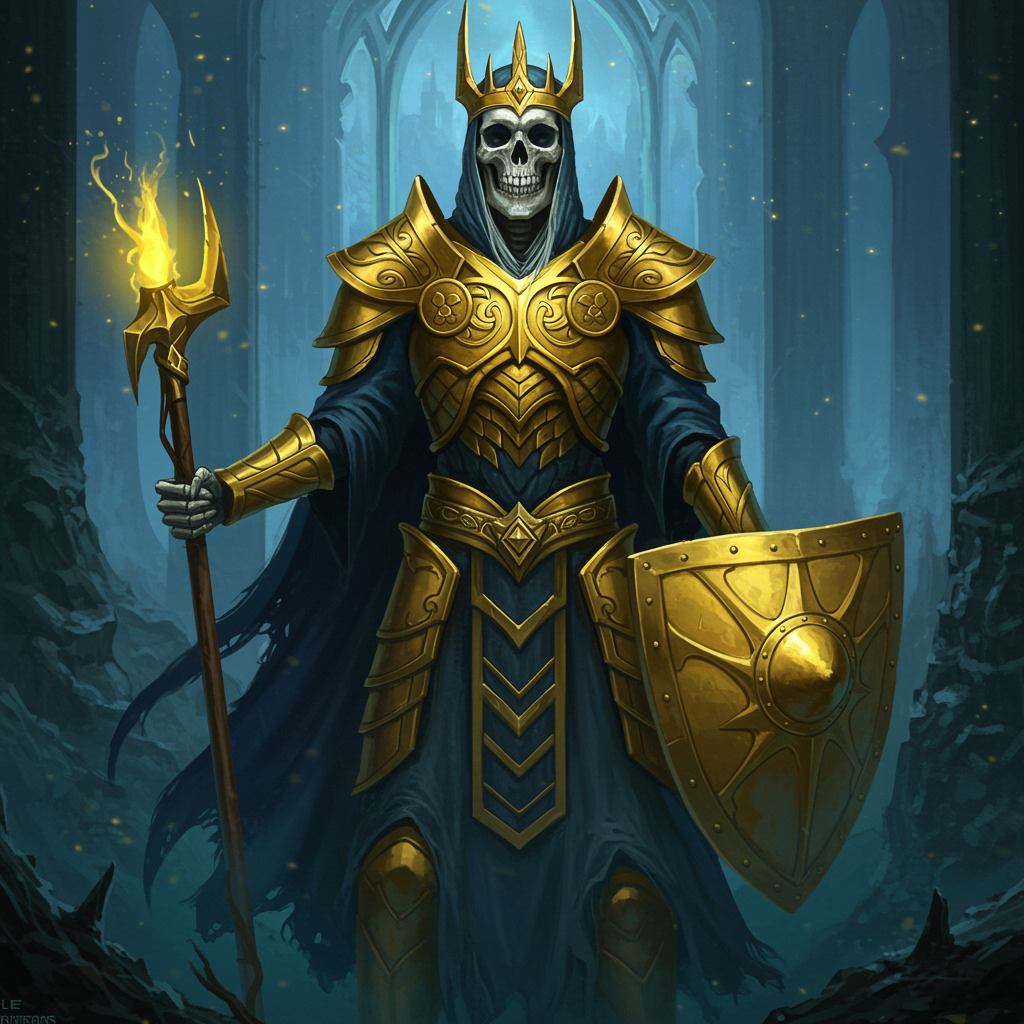 Skeleton Monarch of the Underworld, adorned with Elaborately Crafted Nordic Armor, Ornate and Graceful, Digital Illustration, Captivating Scenery, Hyper-Realistic and Intensely Detailed, with regal shades of golden yellow and deep ultramarine blue. Influenced by Artgerm, WLOP, Greg Rutkowski, and BROM. Please ensure the creation steers clear of anomalies such as duplication, disfigurement, or distortion. Focus on a distinct royal presence, with the piece remaining clear, immersive, and centered, rich in quality and precision.