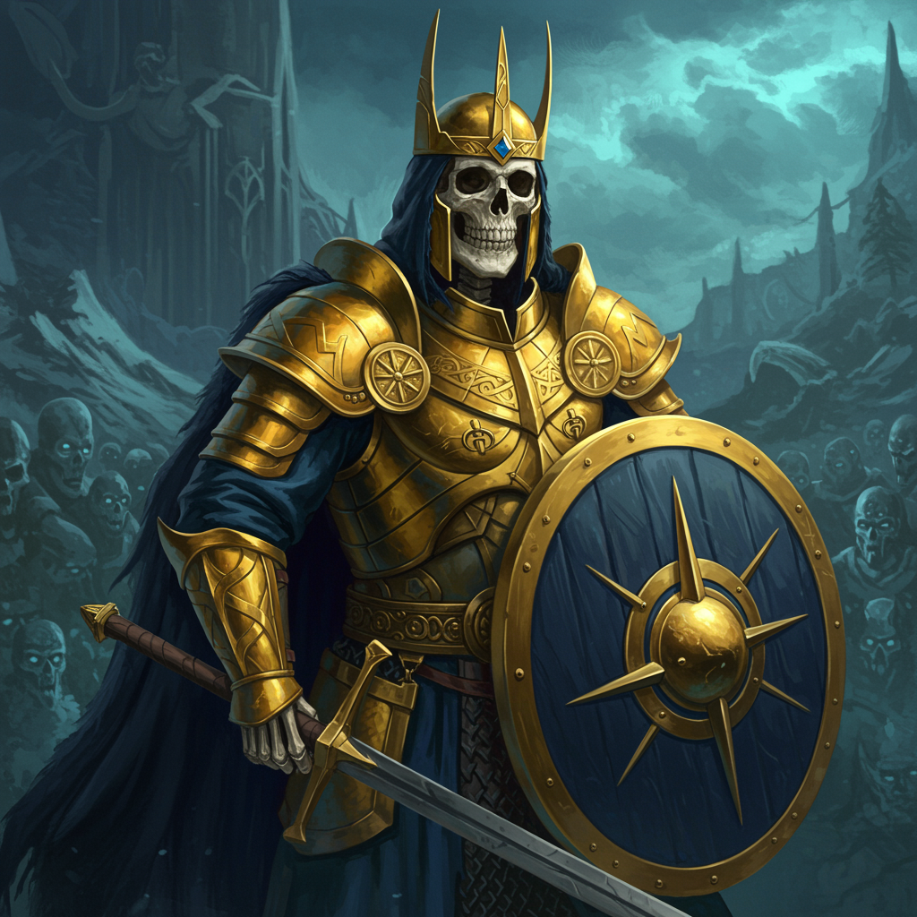 Skeleton Monarch of the Underworld, clad in Elaborately Crafted Norse Armor, refined and sophisticated, digital artwork in a captivating and realistic style. Showcasing regal shades of golden yellow and deep ultramarine blue, influenced by Artgerm, WLOP, Greg Rutkowski, and BROM. Exquisitely detailed yet avoids duplication and distortion, maintaining proportional and balanced features. Surrounded by a picturesque and vivid backdrop that enhances the majestic presence.