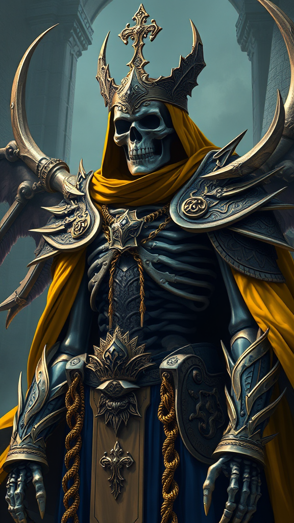 Skeleton Monarch of the Underworld, clad in intricately crafted Norse-inspired armor, featuring a blend of elegance and sophistication, a digital illustration showcasing a scenic, hyper-realistic and ultra-detailed depiction. The color palette includes regal shades of royal yellow and ultramarine blue. The artistic style echoes influences from Artgerm, WLOP, Greg Rutkowski, and BROM. The scene remains free from imperfections, maintaining clear, in-frame, and high-resolution quality, with innovative elements enriching the original concept.