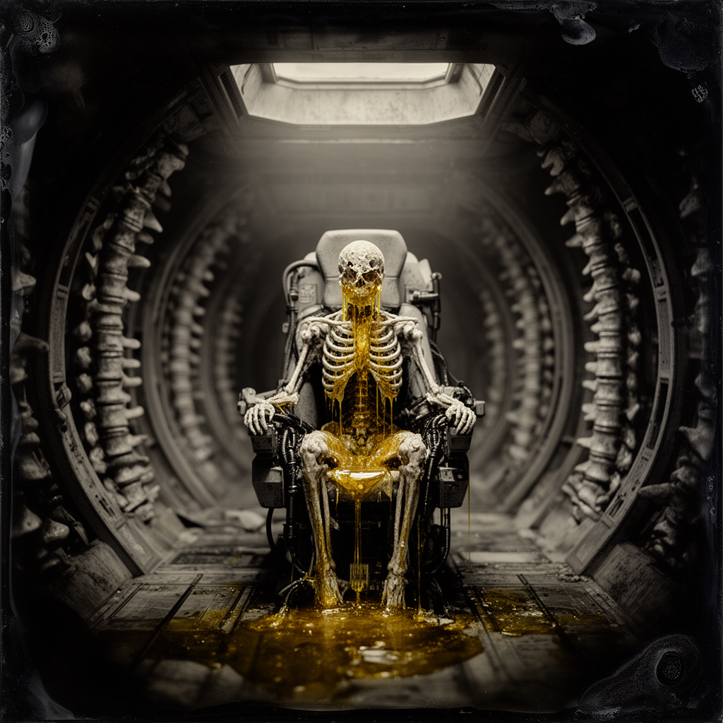 This image is simulated as a large-format Wet Plate Collodion Ambrotype (black glass positive), characterized by its limited tonal range, chemical pour marks at the edges, and a ghostly, shallow depth of field. The scene depicts the interior of a derelict, bio-mechanical starship bridge, where the architecture mimics the interior of a ribcageâcurved, spinal pillars repeating into the darkness. In the center, a colossal pilot's chair has fused with its occupant over centuries of dormancy. The pilot, no longer human, is an exoskeleton of calcified resin and blackened piping. The "gilded grief" manifests as a viscous, gold-colored amber substance that leaks from the pilotâs fractured helmet, pooling in the complex machinery of the lap and dripping onto the floor plates. This fluid glows with a dull, bioluminescent phosphorescence, providing the only illumination in the scene aside from a faint, rim-lighting gray wash from an overhead hatch. The texture is dominated by wetness; every surface glistens with condensation and semi-organic slime. The chemical artifacts of the collodion processâswirls of silver nitrate and accidental thumbprintsâoverlay the image, enhancing the feeling that this is an archaeological record of a tragic, ancient discovery in deep space.