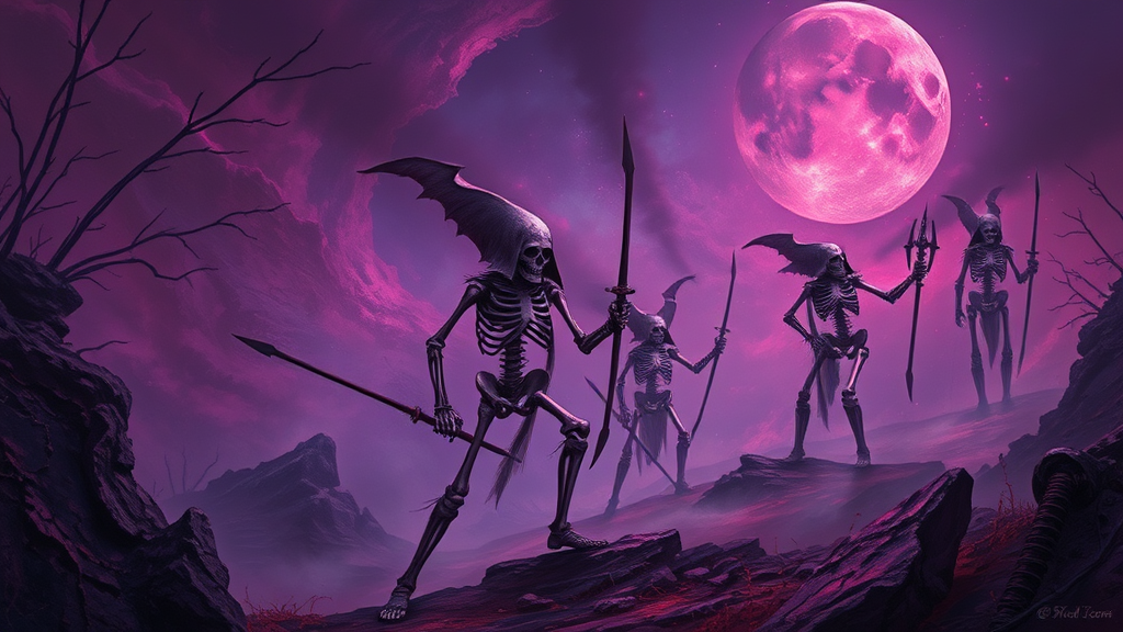Skeleton warriors art, fantasy-themed, suitable for wallpaper, featuring a dark palette of purples and reds, influenced by Magali Villeneuve's style, with celestialpunk elements; designed with a dark and brooding essence, showcasing realistic hyper-detail reminiscent of Zacharias Martin Aagaard's work, set in a mystical landscape with an ethereal glow and intricate textures.
