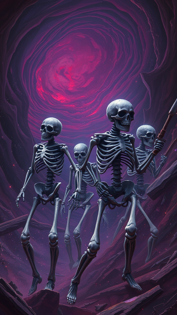 Skeleton warriors emerge in a fantastical realm, set against a backdrop of swirling dark purples and deep reds. The scene is infused with celestialpunk elements, where ethereal stardust dances around intricate bone structures. The art style echoes the dramatic intensity of Magali Villeneuve, capturing a mood that is dark and brooding. Hyper-realistic details highlight every crevice and curve, while the haunting atmosphere is reminiscent of Zacharias Martin Aagaard's work. This visual tapestry is perfect as a striking, immersive wallpaper.