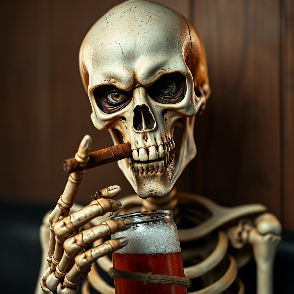 Skeleton with an intense gaze holding a cigar between his teeth, pointing a bony finger at you while gripping a beer, features detailed in UHD with hints of flesh and human skin texture. His eyes are peculiar, with deformed irises and pupils, resulting in a cross-eyed appearance. The face appears cloned, giving an uncanny double-take effect, and his hands exhibit mutations, showing extra fingers. The setting is designed to feel somewhat disjointed, with elements slightly off-balance and cut off, evoking a surreal, dream-like atmosphere without explicit framing or branding elements.