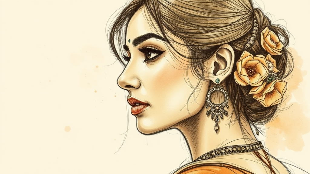 Sketch of a Bollywood actress, Indian heritage, captured in side profile, exhibiting a warm tonal range with artistic flair, showcasing delicate and intricate details; such captivating beauty is almost unbelievable, with subtle creative flourishes enhancing the core essence.