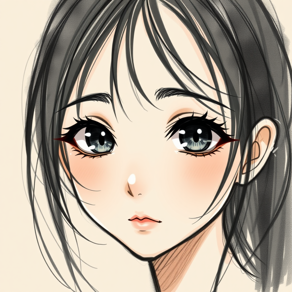 Sketch of a female face with captivating eyes, blending anime aesthetics with the Pont-Aven school style, masterfully exploring texture and employing heavy shading. The composition captures a cute and dreamy essence, subtly influenced by the Barbizon school. The artwork features elongated proportions with a 25:32 aspect ratio, enhancing its unique character.