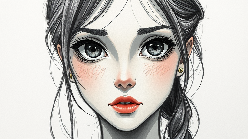Sketch of a female face with expressive eyes, blending anime aesthetics with the rustic charm of the Pont-Aven school, featuring masterful and heavy shading techniques; explore textures to bring out a cute and dreamy essence, infused with the naturalistic style of the Barbizon school.