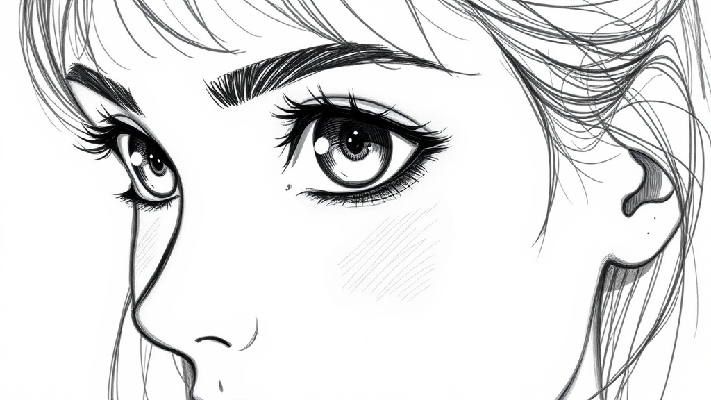 Sketch of a female face with expressive eyes in an anime aesthetic, blending the dreamy qualities of the Pont-Aven school with masterful shading and texture exploration; incorporating heavy shading reminiscent of the Barbizon school, infusing a cute and whimsical charm, maintaining a delicate balance between realism and fantasy in the contours and expressions.