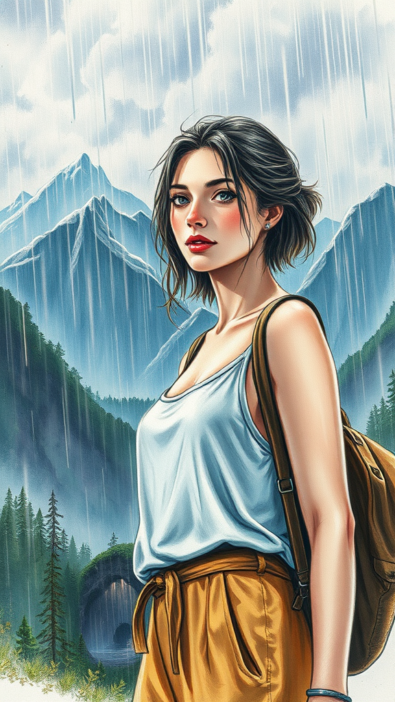 Sketch of an enchanting female traveler, captured with beautiful colored pencil line art, showcasing elegant curves and brush stroke technique. She stands confidently, wearing a tank top and off-shoulder ensemble, embodying the spirit of adventure amidst a dramatic landscape of mountains, dense forest, and a mysterious cave. Heavy rain pours from a watery sky, illuminated by flashes of thunder, while her face glistens with rain and emotion, underscored by emotional music. This beautifully composed scene is rendered in exquisite detail, mimicking trending styles on ArtStation with 8k fine art photography precision. Realistic conceptual art with perfect natural volumetric cinematography lighting highlights soft light and shadows in the scene. The artwork, reminiscent of masterpieces by Raphael, Caravaggio, Greg Rutkowski, Beksinski, and Giger, is an award-winning piece mimicking oil on canvas, with small creative modifications that enhance its core essence.