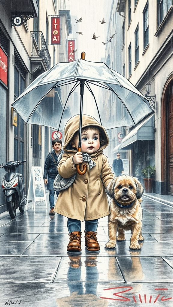 Sketch, stunning colored pencil art with intricate lines, elegant curves, and dynamic brush techniques, depicting an adorable, plump baby holding an umbrella, accompanied by a small dog in a rainy, bustling city alley. The scene captures the essence of emotional birds chirping in a beautifully detailed line drawing style. With perfect composition, this piece showcases incredible detail and exquisite rendering, fitting for a trending ArtStation feature. Imagined as an 8k fine art photograph, it embodies realistic, conceptual artistry. Bathed in natural, cinematic light, with soft shadows, the masterpiece evokes the style of Raphael, Caravaggio, Greg Rutkowski, Beeple, Beksinski, and Giger, offering a unique, award-worthy creation on oil and canvas.