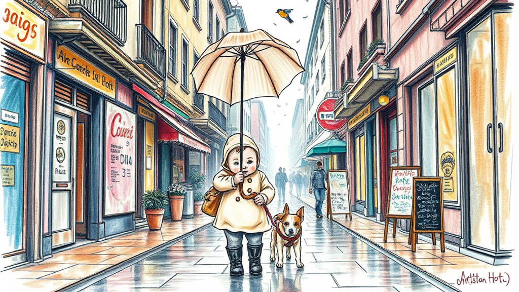 Sketch, vibrant colored pencil line art, elegant curves and brush techniques, artistic and endearing, a plump but adorable baby clutching an umbrella, strolling with a dog through a rain-dappled small alley in a bustling city, melodious birds singing in exquisite line drawing style. Flawless arrangement with remarkable detail and enchanting rendering, styled for ArtStation popularity, high-resolution fine art photography, realistic imaginative art with impeccable lighting in natural volumetric cinematography, gentle illumination and shadows. Award-winning photography with an air of masterpiece, evoking the essence of Raphael Caravaggio, Greg Rutkowski, Beeple Beksinski, and H.R. Giger, with a touch of surrealism.