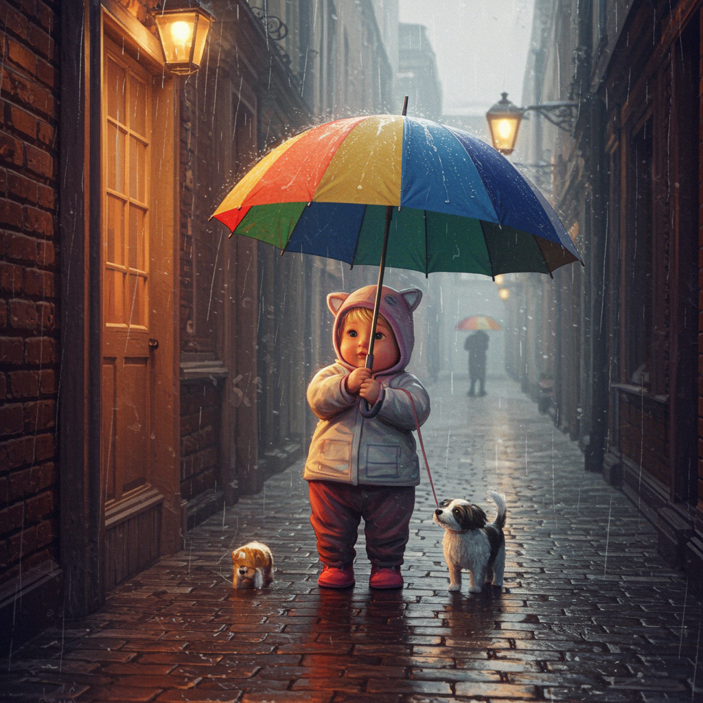 Sketch, Vibrant Colored Pencil Line Art, Graceful Curves and Dynamic Brush Techniques, Charming, Delightfully Plump and Adorable Baby Grasping a Cheerful Umbrella, Strolling with a Playful Puppy, Misty Drizzle, Narrow Alley in a Bustling Cityscape, Expressive Birds Singing in Elegant Line Drawing Style, Impeccable Composition, Astonishing Detail and Stunning Rendering, Gaining Traction on ArtStation, Ultra HD Fine Art Imagery, Realistic Conceptual Art, Perfect Illumination within Natural Volumetric Cinematography, Gentle Light and Shadows, Prize-Winning Photography, Masterstroke, Oil on Canvas, Reminiscent of Raphael and Caravaggio, Echoes of Greg Rutkowski and Beeple, Hints of Beksinski, Touches of Giger.