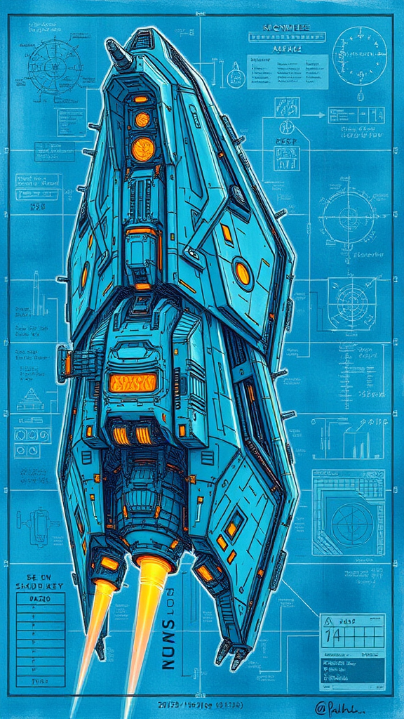 Sketched blueprint of a massive, futuristic sci-fi spacecraft featuring warp engines, intricate formulas, and annotated schematics for each section. Incorporates elements of the golden ratio, enriched with imaginative details and a touch of playful deception. Styled with a vibrant acrylic palette knife technique, drawing inspiration from Makoto Shinkai, Studio Ghibli, and Genshin Impact, blending the whimsical charm of James Gilleard, the ethereal beauty of Greg Rutkowski, and the surreal touch of Chiho Aoshima. The artwork is trending on Pixiv Fanbox, captivating viewers with its visionary design and intricate artistry.
