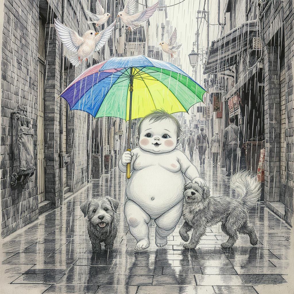 View this AI-generated image featuring sketched illustration showcasing a plump adorable baby holding a vibrant umbrella strolling with a playful dog through a rain drenched alley in a bustling city the scene is enriched by emotional birds tweeting melodiously rendered in an exquisite line drawing s