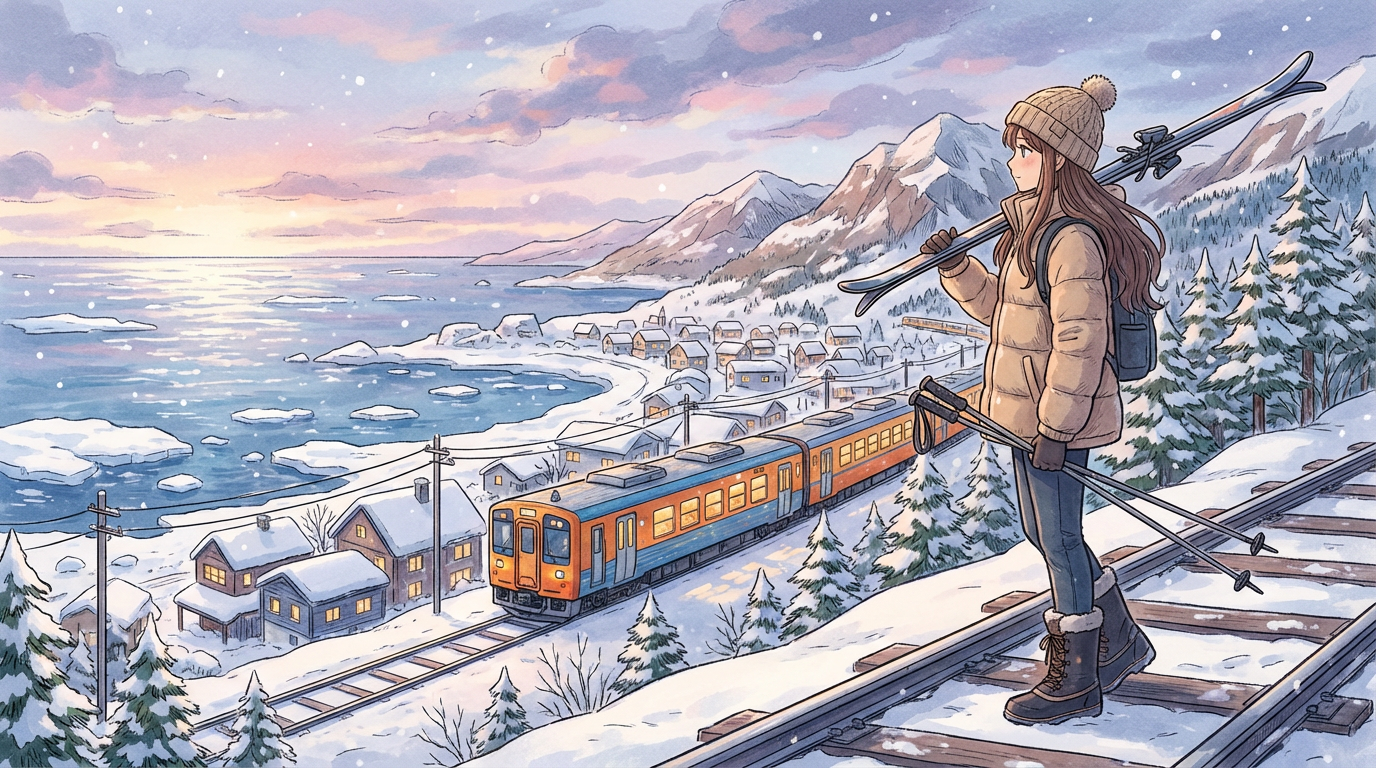 Anime style illustration, full shot of a young woman with long brown hair, wearing a beige puffer jacket, knitted beanie, and boots, holding skis and poles. She stands on a snowy incline next to train tracks, looking towards the left. A vibrant orange and blue train is visible below her, passing through a snow-covered coastal town. In the background, a vast ocean with ice floes and mountains under a cloudy sky with hints of sunset hues. Snow is falling gently. The town lights glow warmly, contrasting with the cool blues and whites of the snow and sky. Overall atmosphere is cozy, serene, and adventurous, with a strong sense of depth and perspective. Detailed, clean lines, subtle textures.