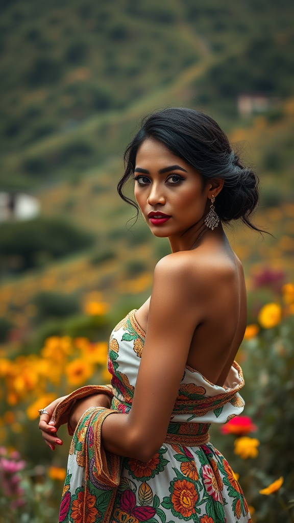 Skillful artistry captured in high-resolution photography showcasing the elegance of a stunning Colombian woman amidst a vibrant, colorful landscape, her graceful posture and expressive gaze reflecting the rich cultural tapestry of Colombia.