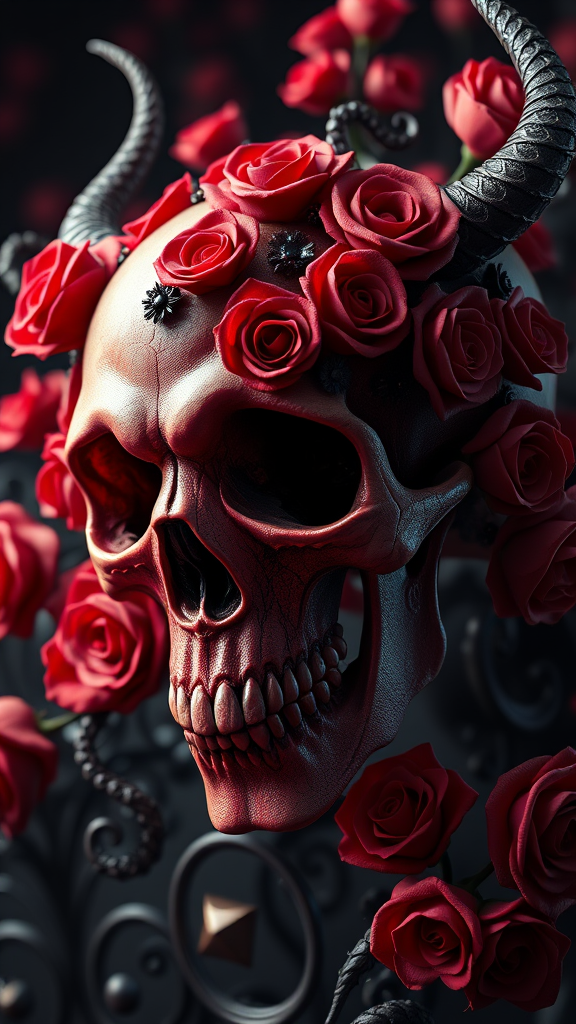 Skull composed of crimson roses, merging organic horror with devilish themes, inspired by Giger and baroque art. Intricate design with art nouveau elements, influenced by James Jean, rendered in photorealistic detail using 3ds Max and V-Ray. Central composition exuding elegance, enhanced by VFX with the capabilities of Unreal Engine 5 and Octane Render. High contrast and sharply defined elements in an anime and manga style, blended into sophisticated digital art. Dynamic glow effects with the finesse of hand-drawn intricacy, in a hyper-detailed 8k resolution rendered using Cinema 4D and Blender. Dark atmospheric ambiance with a cinematic sensuality, sharp focus adding a touch of humor, capturing hyperrealism with a great depth of field. A true masterpiece with vivid colors, reminiscent of professional oil paintings by Ed Blinkey, Atey Ghailan, and styled by Studio Ghibli, Jeremy Mann, and Greg Manchess. Trending on ArtStation and CGSociety, this work boasts intricate high detail and dramatic focus, conveying artistry akin to midjourney and Greg Rutkowski.