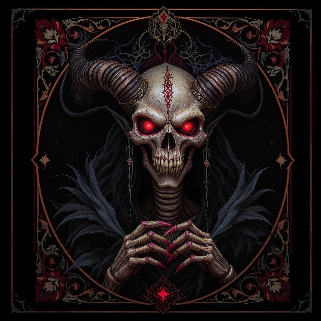 Skull demon mystic portrait concept art inspired by Terese Nielsen, Brom, Miho Hirano, featuring hyperdetailed, intricately gothic art elements trending on Artstation. Employing triadic colors and utilizing Unreal Engine 5 for a detailed matte painting effect, set against a dark black background with an art nouveau influence. The piece explores deep, fantastical colors and intricate details, suitable for a splash screen. Emphasizing complementary colors, this artwork blends fantasy concept art with gothic deviantart sensibilities. Enclosed in an ornate border, vivid colors are presented in 16k UHD, embracing HDR10 quality for an absurdres feel. The portrait showcases a distinctive elongated neck, with extra fingers on mutated hands subtly depicted. Ensure the character retains a mystical aura with a slightly mutated appearance, bringing a unique presence to this gothic-inspired masterpiece.