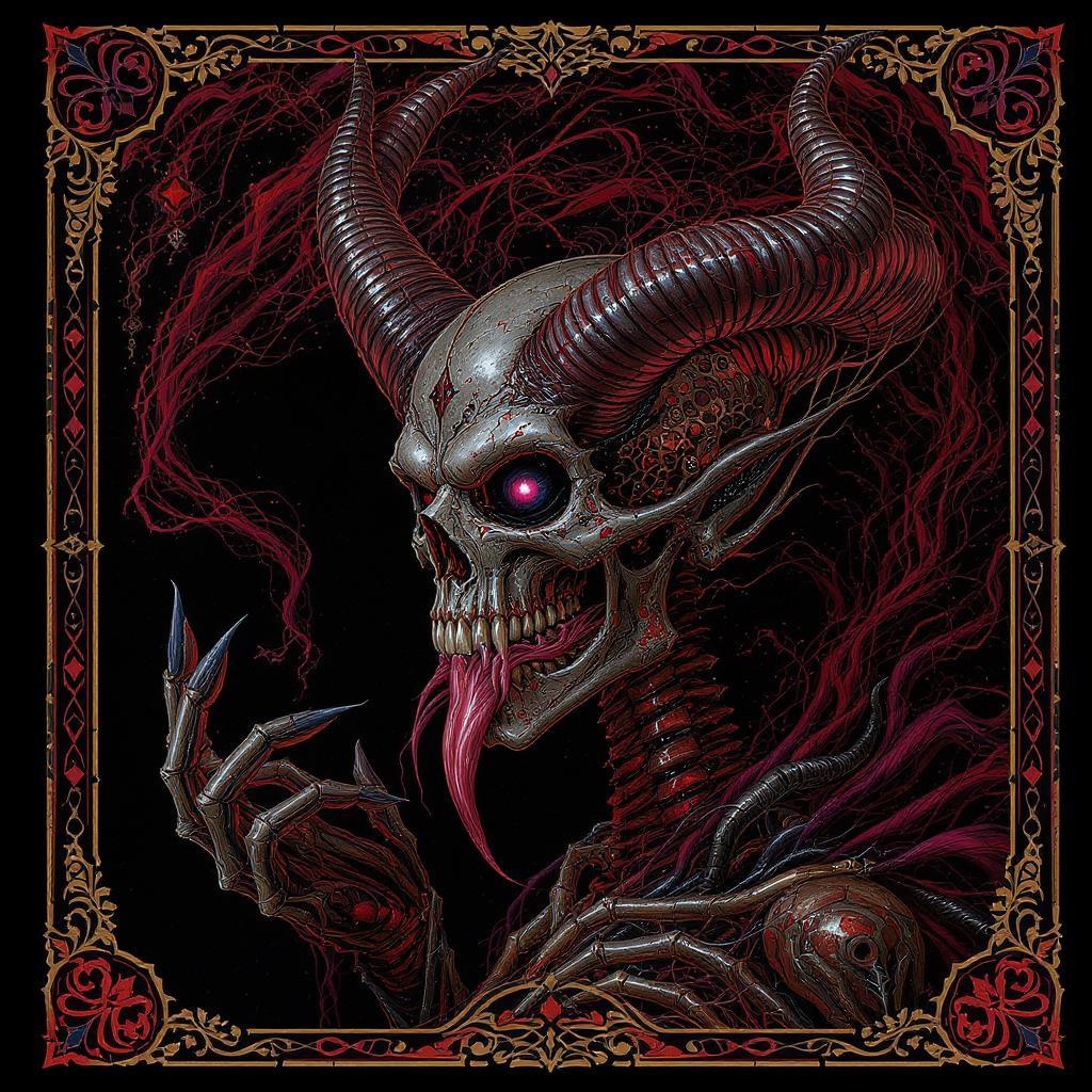 Skull demon sorcerer portrait concept art by Terese Nielsen, Brom, and Miho Hirano, hyperdetailed intricately detailed gothic art, trending on Artstation, using triadic colors with Unreal Engine 5 for a detailed matte painting. Set against a dark black background, featuring art nouveau style with deep, fantastical, and intricate details. Emphasis on a splash screen effect, utilizing complementary colors in this fantasy concept art. A gothic deviantart masterpiece with ornate borders and vivid colors at 16k, UHD, HDR10, absurdres quality, capturing the essence of a model ReV Animated character. Includes unique features such as a long neck and extra fingers, all the while avoiding distractions like low resolution, out-of-frame elements, and any form of digital blemishes, presenting a seamless and engaging visual artwork.
