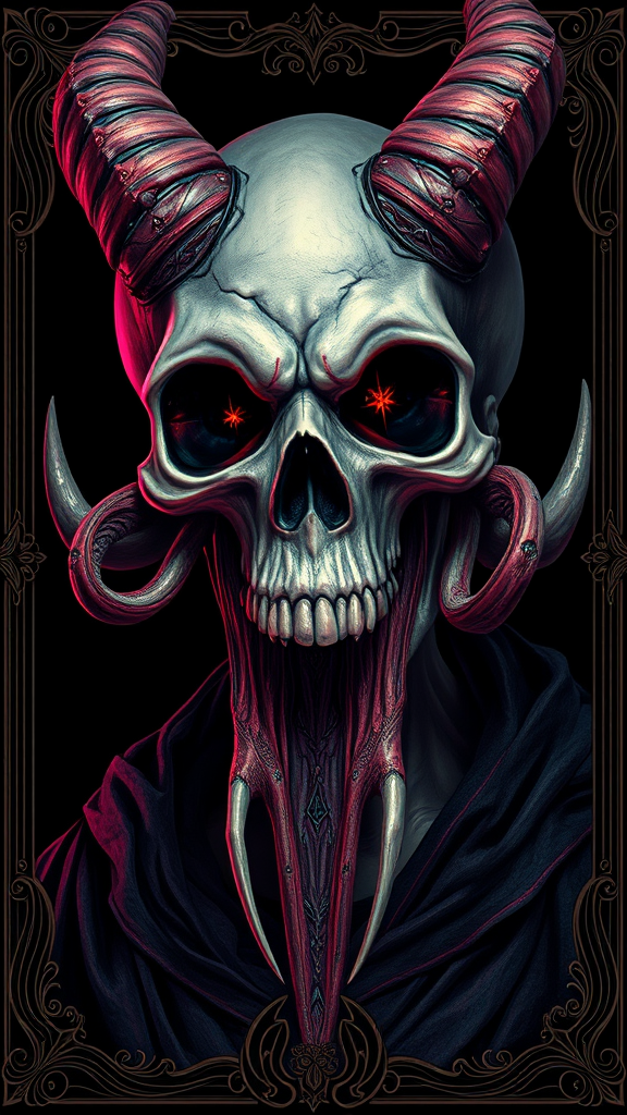 Skull demon sorcerer concept art portrait by Terese Nielsen, Brom, Miho Hirano, hyperdetailed with intricate gothic art, trending on Artstation featuring triadic colors, Unreal Engine 5, matte painting with a dark black background, art nouveau style. The artwork is deep in color and fantastical with intricate details, complemented by a vivid color palette, capturing fantasy concept art in a gothic deviantart masterpiece. It includes an ornate border, presented in 16k UHD HDR10 resolution, with absurdes imagery. Maintaining the essence with creative variations, the portrait has unique, otherworldly elements like cross-eyed features, elongated neck, and extra fingers, emphasizing its ethereal, mutated form. The overall composition is cohesive, without any out of frame elements, blurred lines, or unnecessary distortions like logos or text cluttering the visual narrative.
