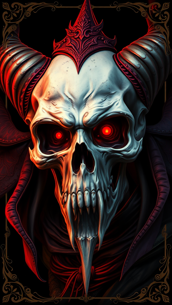 Skull demon sorcerer concept art portrait by Terese Nielsen, Brom, Miho Hirano, hyperdetailed gothic art trending on Artstation, triadic colors, Unreal Engine 5 matte painting, dark black background, art nouveau, deep colors, fantastical, intricate detail, splash screen, complementary colors, fantasy concept art, gothic deviantart masterpiece, ornate border, vivid colors, 16k, UHD, HDR10, absurdres, model ReV Animated v1.21 style, detailed, unique composition, enigmatic expression, mysterious aura, ethereal presence, elongated features, imaginative interpretation, abstract design elements, fantasy lore.