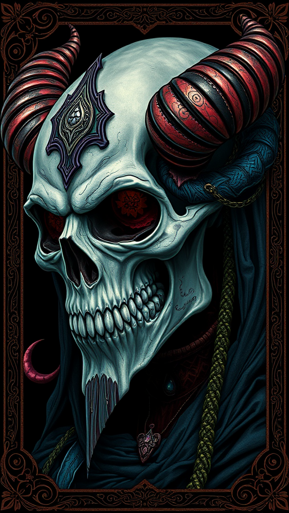 Skull demon sorcerer concept art portrait by Terese Nielsen and Brom, infused with Miho Hirano's style, featuring hyperdetailed intricate gothic art. Trending on ArtStation, it utilizes triadic colors and the rendering power of Unreal Engine 5 to create a detailed matte painting. With a dark black background, the piece channels art nouveau with deep color tones. This fantastical work showcases intricate details fit for a splash screen, employing complementary colors to enhance its fantasy essence. A gothic DeviantArt masterpiece, it features an ornate border and vivid colors, rendered in stunning 16k UHD, HDR10, and Absurdres quality. Blending surreal elements, the design subtly avoids duplication or disfigurement, maintaining artistic integrity while sidestepping disruptive artifacts like blurry images, jpeg nuances, unwanted watermarks, logos, or text. Enhanced with a fantastical, elaborate essence, the concept art remains clearly within the frame, avoiding any cartoonish or split imagery elements.