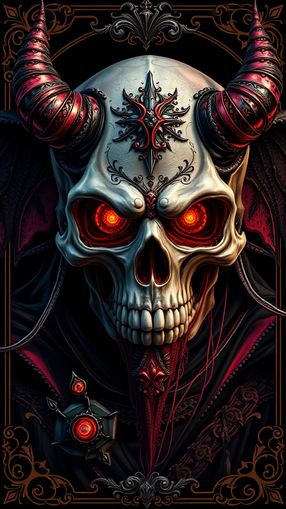 Skull demon sorcerer concept art portrait by Terese Nielsen, Brom, Miho Hirano; hyperdetailed intricately designed gothic art, trending on Artstation, triadic color scheme, crafted in Unreal Engine 5, detailed matte painting; dark black background enhanced with art nouveau style, deep colors, fantastical elements, intricate detailing; envisioned as a splash screen with complementary colors; a gothic masterpiece fit for DeviantArt; surrounded by an ornate border, vivid colors in 16k resolution, UHD, HDR10 quality; fantastically absurd resolution. Avoid elements like low resolution, out-of-frame subjects, blurriness, or visual artifacts like watermarks or logos. The design maintains a fantasy concept art aesthetic, focusing on the core theme and enhancing it with creative imagination.