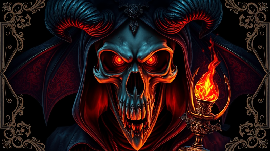 Skull demon sorcerer concept art portrait by Terese Nielsen, Brom, Miho Hirano, hyperdetailed intricately detailed gothic art trending on Artstation triadic colors Unreal Engine 5 detailed matte painting, dark black background, art nouveau, deep color, fantastical, intricate detail, splash screen, complementary colors, fantasy concept art, gothic deviantart masterpiece, ornate border, vivid colors, 16k, UHD, HDR10, absurdres, vivid animated imagery, enigmatic presence, mystical aura, visionary elegance, surreal dimension, dual-toned vibrancy, ethereal composition, chimerical elements, otherworldly charm, metaphysical allure, emotive expression, supernatural ambiance, mystique, tenebrous atmosphere, arcane aesthetics.