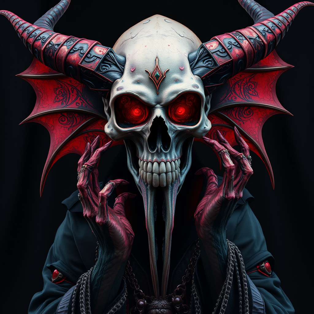 Skull demon sorcerer concept art portrait featuring a blend of influences from Terese Nielsen, Brom, and Miho Hirano, characterized by hyperdetailed gothic elements. This artwork, trending on Artstation, employs triadic colors and utilizes the power of Unreal Engine 5 for a detailed matte painting effect. Set against a dark black velvet background, it incorporates art nouveau elements with a deep color palette. The fantastical scene is rich in intricate detail, perfect for a splash screen, using complementary colors to enhance the fantasy concept. The result is a gothic deviantart masterpiece with vivid 16k resolution, UHD quality, and HDR10 compatibility, showcasing absurdly high resolution. The figure features surreal elements, such as a long neck and intricately rendered hands, while avoiding typical pitfalls of low-quality art such as out-of-frame subjects, blurry areas, or any artifacts like watermarks or logos. The focus remains on a seamless, richly detailed fantasy portrait.