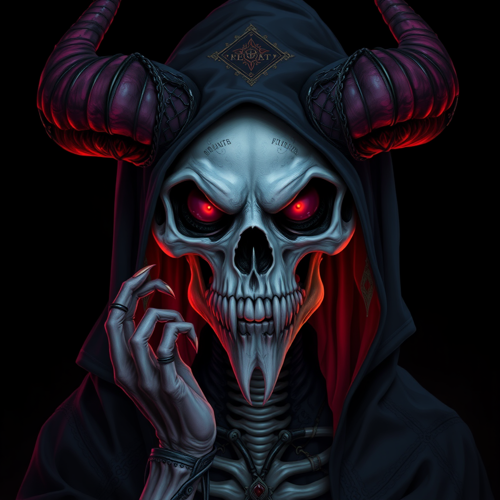 Skull demon sorcerer concept art portrait inspired by Terese Nielsen, Brom, Miho Hirano, hyperdetailed gothic art trending on Artstation. Intricately detailed with triadic colors, set in a dark black velvet background. Influences of art nouveau, featuring deep, fantastical elements and intricate details suitable for splash screens. Complementary colors enhance the fantasy concept, lending a gothic, deviantart masterpiece feel with vivid, captivating colors. Rendered in 16k resolution with UHD and HDR for an extraordinarily high-definition experience, reminiscent of a ReV Animated masterpiece. Elements of duplicity in character design offer uniqueness, capturing cross-eyed features and elongated neck, subtly hinting at extra fingers in mutated hands, while avoiding disfigurement. The artwork remains sharp and in focus, free of artifacts, watermarks, or distracting elements, ensuring the subject stays within frame, delivering a seamless, visually stunning fantasy portrait.