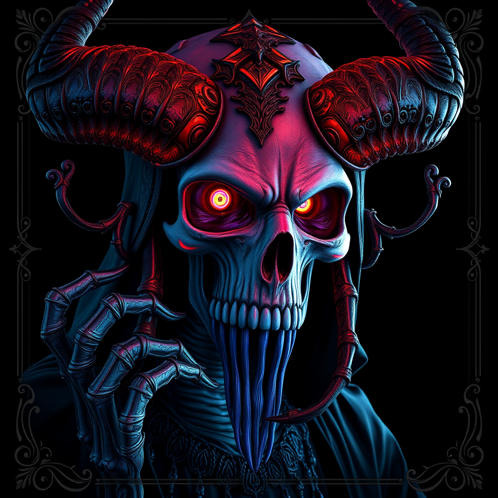 Skull demon sorcerer concept art portrait inspired by Terese Nielsen, Brom, and Miho Hirano. Hyperdetailed and intricately crafted gothic art trending on Artstation, featuring triadic colors. Designed using Unreal Engine 5 for detailed matte painting, set against a dark black background. This piece is infused with art nouveau influences, showcasing deep and vivid colors in a fantastical display. A splash screen of fantasy concept art, the gothic deviantart masterpiece is framed with an ornate border. Vivid colors produce a high-resolution 16k, UHD, HDR10 experience, offering an absurdres level of detail. This artwork captures the fantastical with elements like cross-eyed expressions, elongated neck, and extra fingers, emphasizing an otherworldly, surreal appearance without sacrificing clarity or focus.