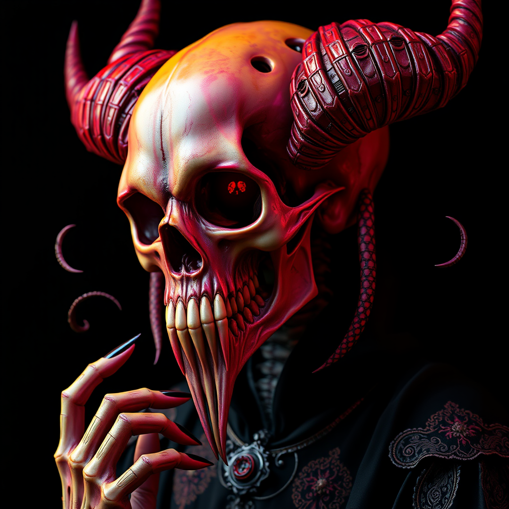 Skull demon sorcerer concept art portrait inspired by Terese Nielsen, Brom, and Miho Hirano, showcasing hyperdetailed and intricately gothic art. This piece features a mesmerizing combination of triadic colors, presented as a striking matte painting in Unreal Engine 5. The dark black velvet background accentuates the art nouveau style, with deep, fantastical colors bringing the sorcerer to life. It's a splash screen of complementary colors, embodying fantasy concept art with a gothic, deviantart masterpiece feel. The vivid colors are presented in 16k, UHD, HDR10, demonstrating absurd resolution, where each detail is meticulously crafted. The character has an elongated neck and subtly altered features, like extra fingers and unique hand shapes, evoking a sense of mutation and transformation while maintaining a sense of otherworldly elegance. This composition, free of any low-resolution or out-of-frame elements, avoids distractions like blurriness, jpeg artifacts, and watermarks, delivering a sharp, immersive visual experience.