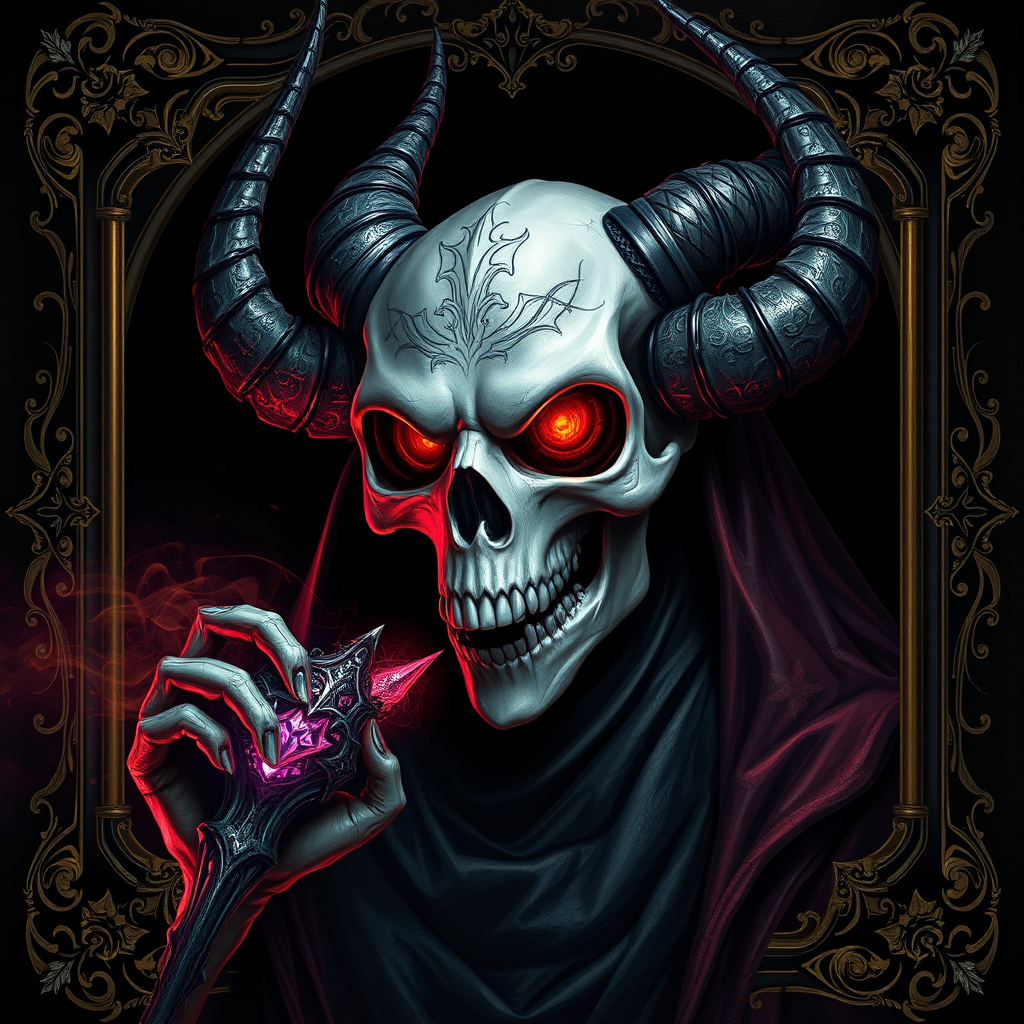 Skull demon sorcerer concept art portrait inspired by the styles of Terese Nielsen, Brom, Miho Hirano, featuring hyperdetailed, intricately designed gothic art showcased on Artstation with triadic colors. Rendered using Unreal Engine 5 as a detailed matte painting, the artwork presents a dark black background framed in art nouveau style. The piece combines deep, fantastical colors with complementary hues to create a vivid and captivating splash screen. This fantasy concept art, reminiscent of a gothic deviantart masterpiece, includes an ornate border and showcases rich, vivid colors in an ultra-high-definition 16k resolution, with HDR10 and absurd detail. The overall presentation reflects surreal aesthetics, avoiding any low-resolution elements, out-of-frame issues, or distractions like blurry sections, jpeg artifacts, watermarks, logos, letters, usernames, cropped sections, cartoonish aspects, or split images.